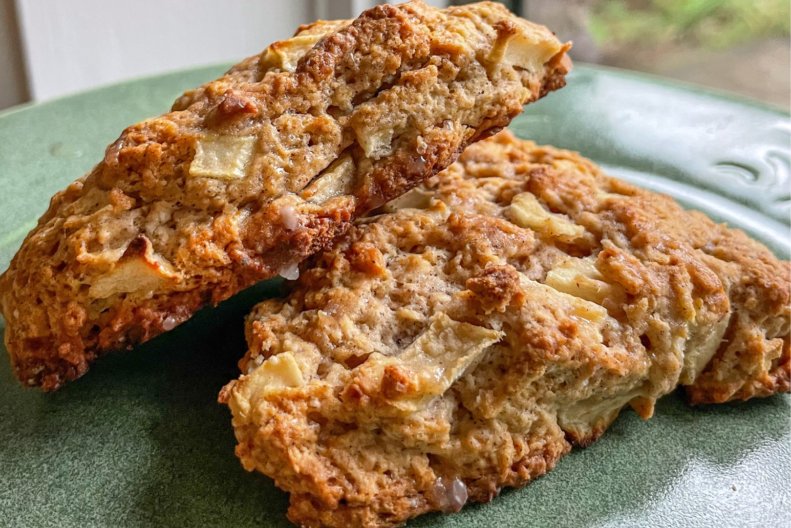 Gehackte Reinette-Äpfel werden mit Zimt und Muskatnuss in den Teig gemischt und zu weichen, buttrigen Scones gebacken – lecker zu einer Tasse Tee.